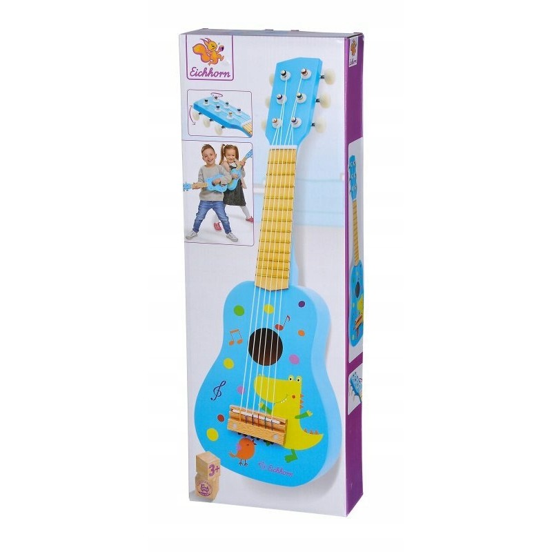 Drewniana gitara dla dzieci ze strunami metalowymi, które należy odpowiednio nastrajać.