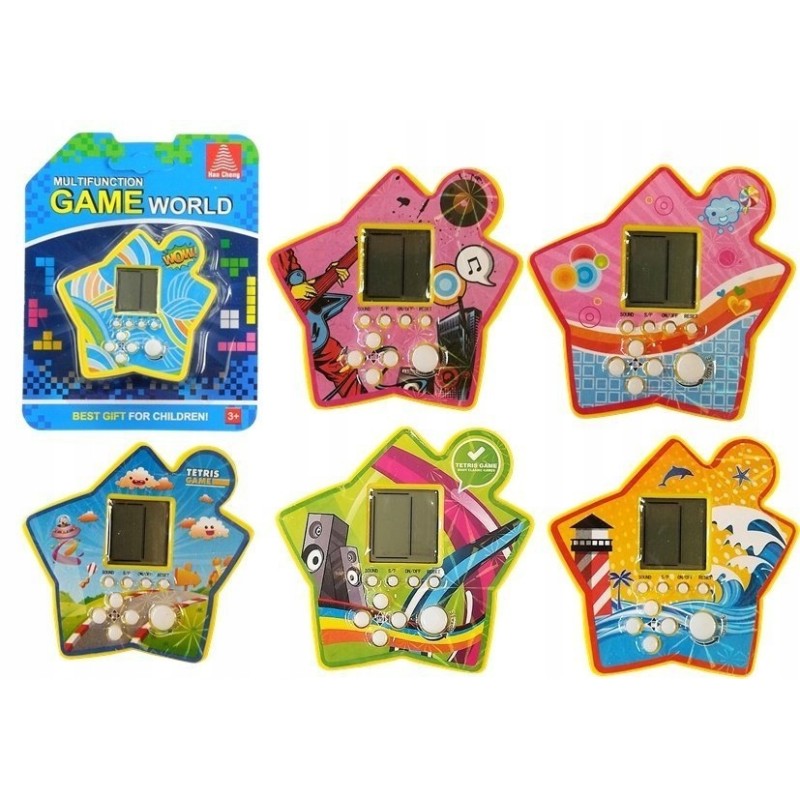 Gra elektroniczna w obudowie w kształcie gwiazdy jest bardzo lekka, co w połączeniu z niedużymi wymiarami czyni ją kieszonkowym wariantem, który możesz zabrać ze sobą wszędzie. Składa się z wyświetlacza oraz białych przycisków odpowiadających za funkcje gry. Możemy nimi uruchomić i wyłączyć grę, zatrzymać rozgrywkę, wyłączyć dźwięki lub zresetować planszę, by móc zacząć układać klocki od początku. Pozostałe przyciski służą do nawigacji podczas gry, a także obracania klocków. Kieszonkowa wersja gry elektronicznej umili czas zarówno dziecku, jak i dorosłemu. Rewelacyjnie sprawdzi się w przerwie pomiędzy zajęciami, a także w autobusie lub w domu podczas relaksu.