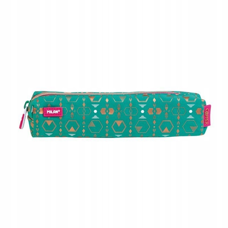 Piórnik MILAN mini kwadratowy z kolekcji COPPER III zapinany na suwak w kolorze zielonym z wzorami. Materiał: podszewka zewnętrzna i wewnętrzna 100% z poliestru. Rozmiar: 20,5 x 4,5 x 5 cm.