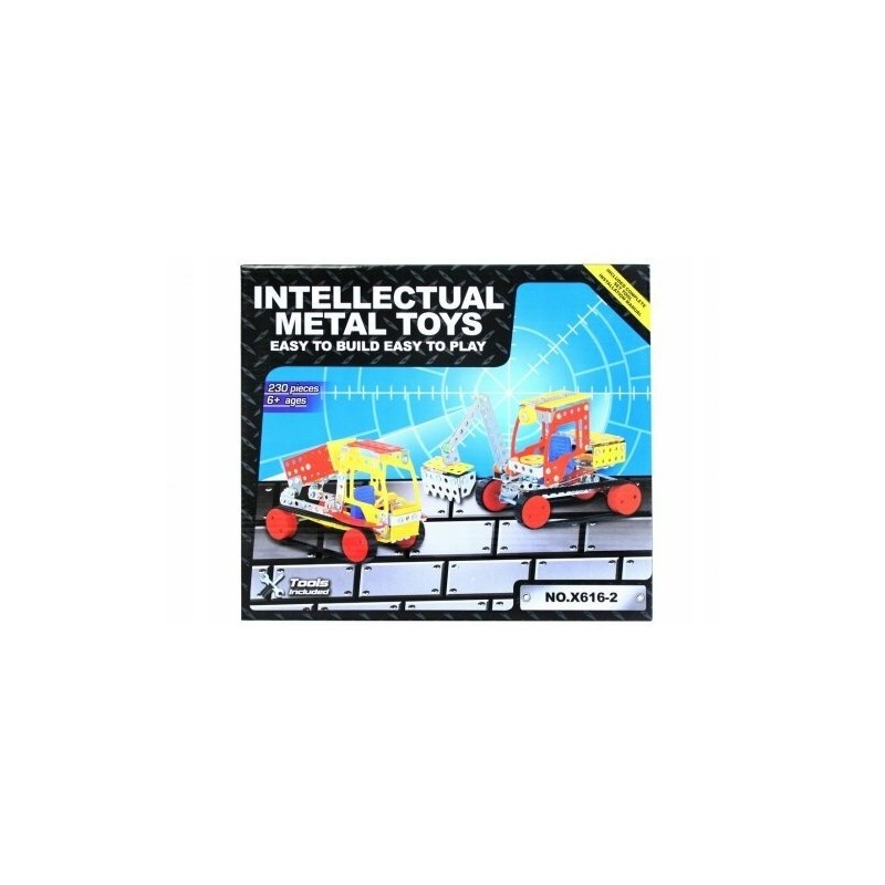 Metalowy zestaw konstrukcyjny od EURO-TRADE. Pozwala nam zbudować dwa pojazdy - koparkę i samochód transportowy. Pojazdy będą wyposażone w specjalne gąsienice. Elementy znajdujące się w pudełku są kolorowe. Maszyny będą posiadać podstawowe cechy pojazdów drogowych (np. kierownica, siedzenia). Zestaw łatwy w konstrukcji.