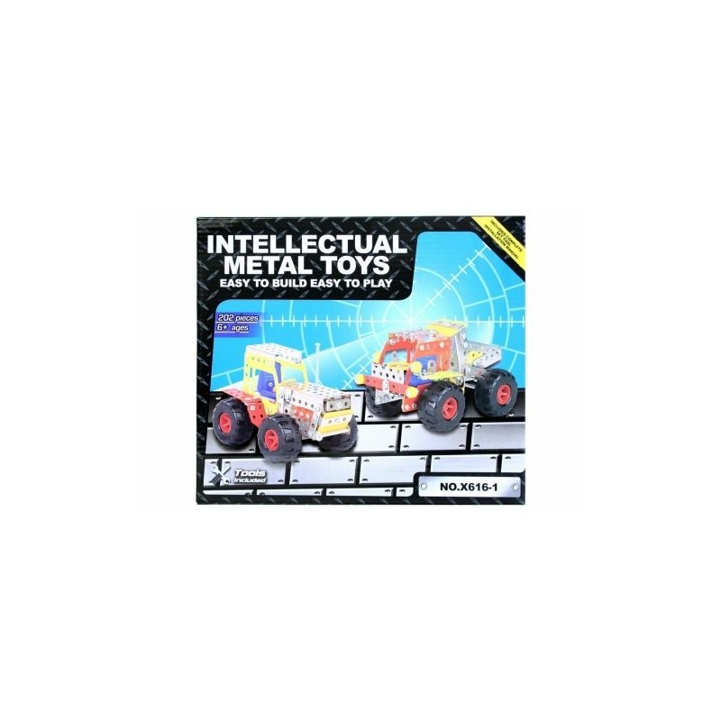 Klocki konstrukcyjne (metalowe auto i traktor) od EURO-TRADE. Zestaw składa się z 202 elementów, z których możemy skonstruować pojazdy (według załączonej instrukcji). W pudełku znajdziemy różnej wielkości metalowe elementy, które należy samodzielnie zmontować. Niektóre z nich posiadają klasyczny, metaliczny połysk, inne wykonane są w określonym kolorze. Auta składamy przy użyciu śrubek i śrubokręta. Zabawka rozwija zdolności manualne, wyobraźnię przestrzenną, umiejętności techniczne i cierpliwość.