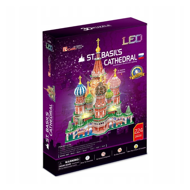 Puzzle 3D Katedry Świętego Bazyla w wersji zawierającej oświetlenie LED. W opakowaniu znajduje się 224 puzzle, wykonane ze specjalnego materiału przypominającego piankę. Puzzle są ponumerowane, ponacinane i umieszczone na arkuszach. Wystarczy bez użycia siły wycisnąć element z arkusza i zmontować go zgodnie z dołączoną instrukcją, bez użycia kleju ani specjalnych narzędzi. Wielkość budowli po złożeniu to 29x25x37 cm. Zestaw wymaga 2 baterii AA 1,5V (nie dołączono).