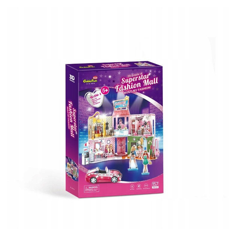 Opakowanie zawiera puzzle 3D, które umożliwiają złożenie modelu Modnego Centrum Handlowego. Pasjonująca zabawa dla dzieci oraz kolekcjonerów. Do ich złożenia nie potrzeba żadnych narzędzi. Puzzle są ponumerowane i znajdują się w specjalnych arkuszach. W opakowaniu znajduje się 157 puzzli.