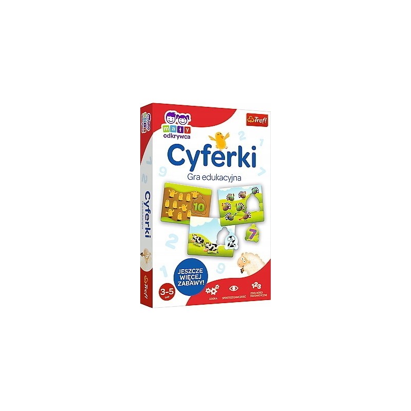 Cyferki to układanka edukacyjna, która poprzez wesołą zabawę wprowadza dziecko w świat liczb. Gra zawiera proste zadania, dzięki którym dziecko opanowuje sztukę liczenia do dziesięciu. To świetny pierwszy krok do nauki działań matematycznych. Wyraźne ilustracje ułatwiają maluchom liczenie poszczególnych elementów, ale także szacowanie ich liczby w danym zbiorze. Zawartość: 10 planszetek z wyjmowanymi cyframi, liczmany, instrukcja z wieloma propozycjami zabaw Wymiary opakowania: 28,5 x 19 x 4 cm Gra dla 1-4 graczy w wieku 3-5 lat