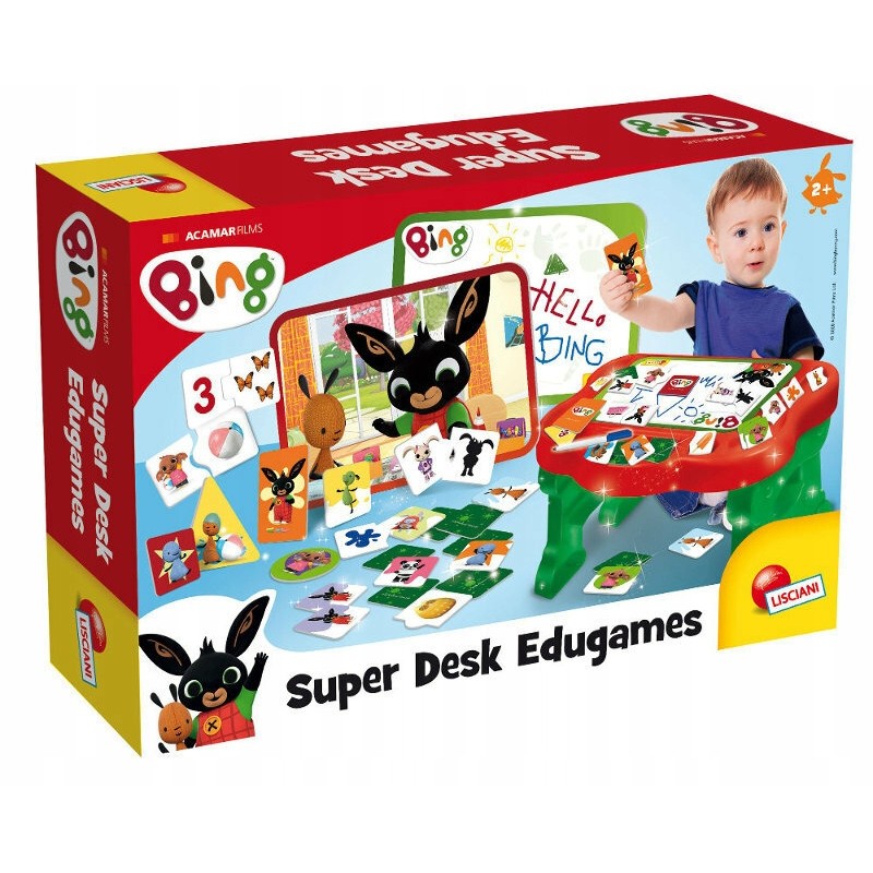 Biurko edukacyjne z bohaterami bajki BING. Dzieci mogą rozpocząć zabawę z biurkiem BING i bogatym zestawem gier oraz aktywnościami edukacyjnymi, które rozwijają logikę, uwagę, pamięć i wyobraźnię. W zestawie znajdą: grę pamięciową, minipuzzle do nauki kolorów, cyfr, grę z kształtami geometrycznymi, rozpoznawanie kształtów, suchościeralną tablicę z markerem do nauki pisania i czytania oraz instrukcje gier. Jest to idealny prezent dla fanów i fanek wspomnianej bajki, ale również i dla tych dzieci, które jej nie znają (bajkowe grafiki ze zwierzątkami przyciągną uwagę każdego malucha).