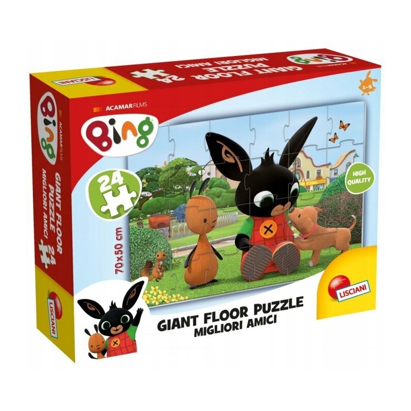 Wielkie puzzle podłogowe z bohaterami znanymi z kreskówki Bing. Zestaw składa się z 24 wytrzymałych puzzli wysokiej jakości, które po złożeniu tworzą obrazek o wymiarach 70x50cm.