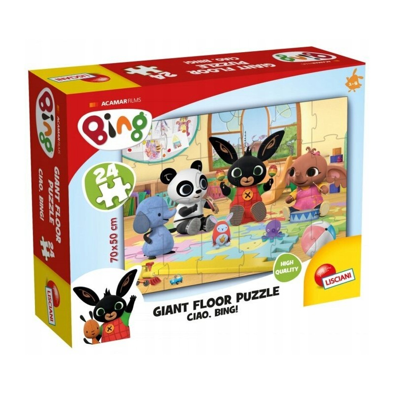 Wielkie puzzle podłogowe od LISCIANI z bohaterami znanymi z kreskówki Bing. Zestaw składa się z 24 wytrzymałych puzzli wysokiej jakości, które po złożeniu tworzą obrazek o wymiarach 70x50cm. Grafika przedstawia bawiące się zwierzątka, które dzieci znają z bajki. Postaci mają duże oczy, co przyciąga uwagę nawet tych dzieci, które nie znają bajki. Wszystko zapakowano w solidne, tekturowe pudełko.