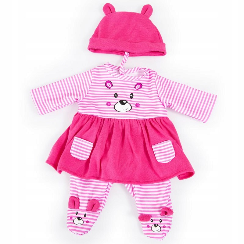 Ten wspaniały strój dla lalek składa się z trzech części i został zaprojektowany z pięknymi różowymi detalami. Dodatkowo strój ma wspaniały motyw misia. Zestaw składa się z sukienki, spodni i czapki. Dzięki rzepowi na sukience i gumce na spodniach nawet małe dzieci mogą łatwo ubrać swoją lalkę. Dzięki temu ubranku Twoja ulubiona lalka nie tylko zyska indywidualny wygląd, ale także będzie ćwiczyć zręczność podczas zabawy. Ubranko sprawdzi się idealnie dla lalek od 40 do 46 cm.